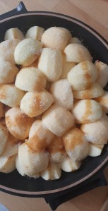 Laissez chauffer le sucre et cuisez-le jusqu’à qu’il caramélise. Hors du feu, incorporez 80 g de beurre en morceaux en mélangeant délicatement. Si vous avez réalisé votre caramel dans une casserole versez-le dans un plat à tarte (Attention c’est chaud).